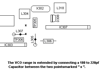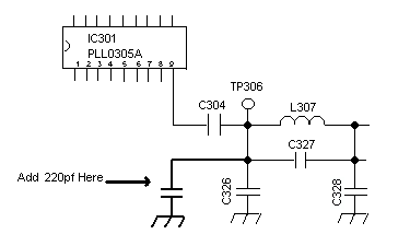 Install a small ceramic capacitor between the long lead of L307 and ground. Any value between 180 and 220 picofarad (pf) will do. There is a convenient ground located just behind L307. this location is a plate-through hole (it looks like a shiny solder dot showing through the silk screening.)