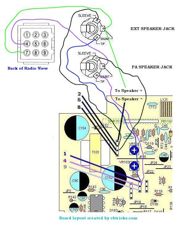 The diagram shows how to connect the External Speaker and a PA Speraker jack to the existing circuit.