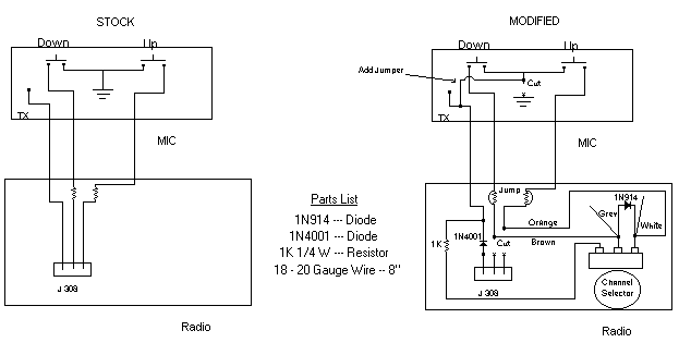 Mod #2 is the same principal as Mod #1, But uses a Solid State approach, and does not require rewiring of the Microphone. This Mod also allows for an automatic frequency increase or decrease as long as you hold the button down.